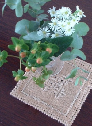 お気に入りの桜の布に こんどはAjour刺繍 布を切らないのに透かしが入り まさしく明り取りの小窓 小さな桜のコースターです。
